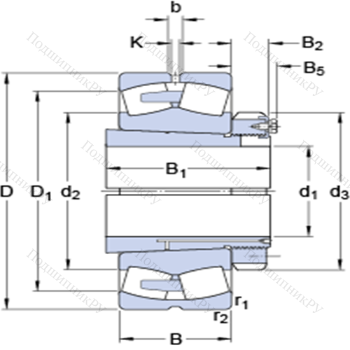 Сферические роликоподшипники на закрепительной втулке 231/530 CAK/W33 + OH 31/530 H у которого конструкционной особенностью являются ролики в форме конуса и разъемный корпус. Изделие также может быть укомплектовано наружным кольцом с упорным бортиком или большим углом, двухрядными или четырехрядными роликоподшипниками, утолщенной внешней шиной.