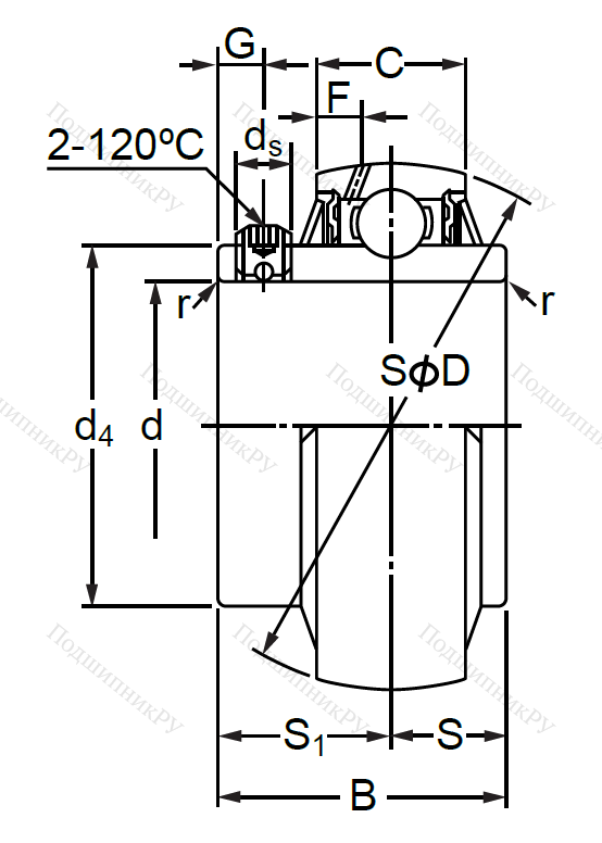 Шариковое радиальное подшипниковое тело, имеющее однорядную конструкцию с расширенной внутренней шиной и двумя уплотнениями. Данное кольцо может выпускаться с различными вариантами крепежа: втулка для закрепления, стопорное эксцентриковое кольцо, винты. Конструкция предназначена для работы совместно с корпусами типов UCP, UCT, UCF, UCPA, UCFL с шириной или высотой подшипника B(H): 75мм.