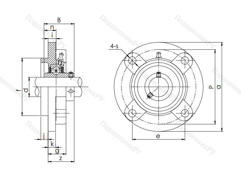 Фланцевая гильза из чугуна или стали оснащена корпусным радиальным шарикоподшипником UC-серии, имеющим внутреннюю обойму удлиненного вида и винтовой стопорной крепеж. Монтаж детали осуществляется методом подгонки.